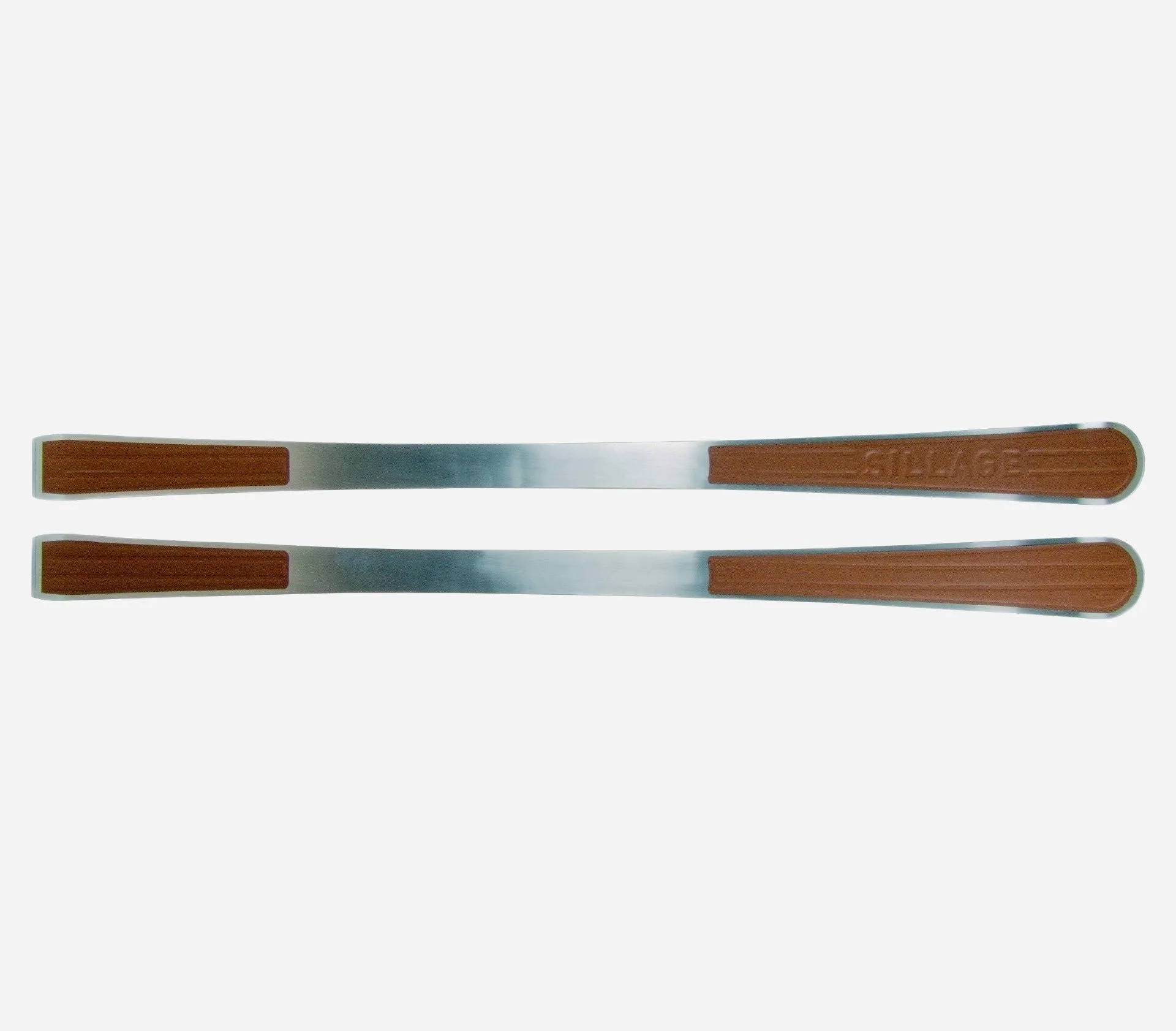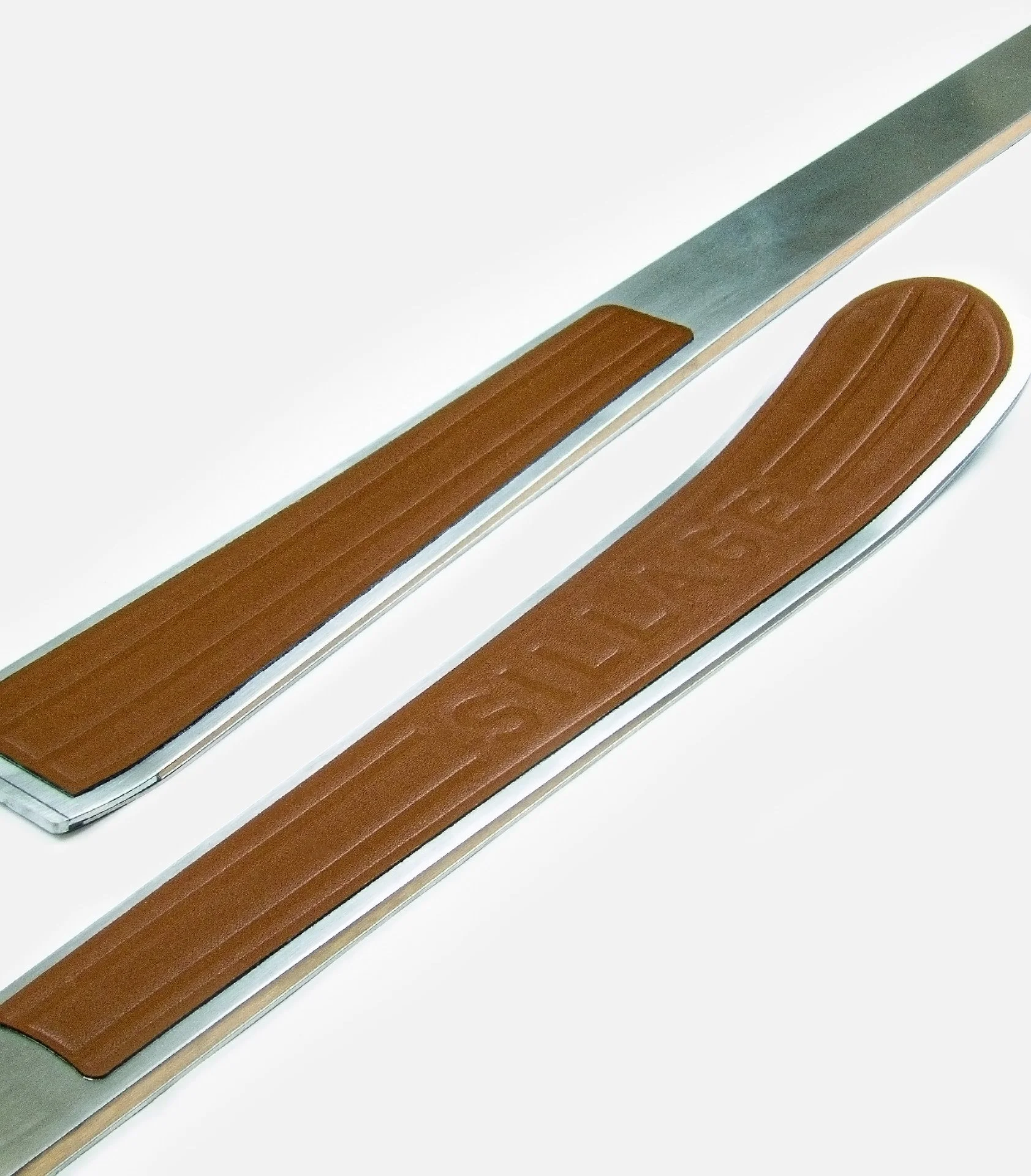 “ Carbon, stone, bamboo... Of course, leather was the next challenge. The biggest challenge of all. Leather will will not be durable, it won't hold. Yes, it will, but yes, it will wear out (but not quickly). This is where the function of leather as a wear part comes into its own. We can have your skis being repaired ! We remove the leather, polish the aluminum and re-complex the leather - that's the innovation behind this ski. Proud to say: “Don't recycle, keep your skis” And between you and me, it's a beautiful one “